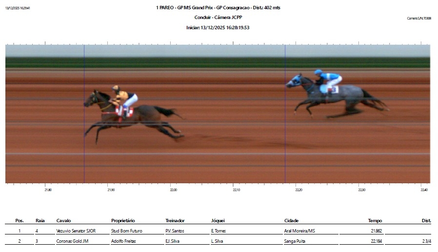 O 1º Pareo do GP Consagração (402m), Ultima Prova do Grand Prix Ms 2025 . No sábado, 13 de Dezembro 2025, o Animal VEZUVIO SENATOR SJOR ( LOUISIANA SENATOR x KILAUEA, por FOOSE) mostrou talento e potência ao vencer de forma incontestável.