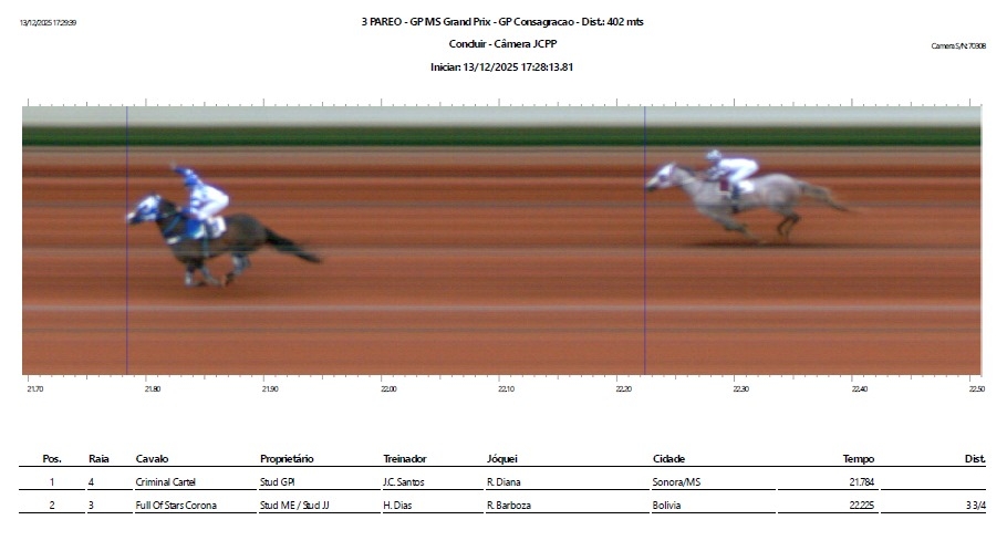 O 3º Pareo do GP Consagração (402m), Ultima Prova do Grand Prix Ms 2025 . No sábado, 13 de Dezembro 2025, o Animal CRIMINAL CARTEL ( GOLD MEDAL JESS x CORTONA CARTEL por CORONA CARTEL) mostrou talento e potência ao vencer de forma incontestável. Competindo pela raia 4, ele partiu com força, tomou a ponta logo na largada e manteve o ritmo firme até a linha de chegada, cruzando com o tempo de 21.784s o Melhor tempo do dia. — 3 corpo e meio de vantagem sobre o adversário
